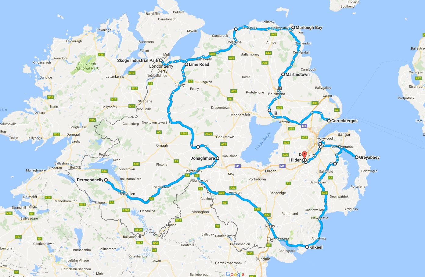 DAY 1: Carrickfergus, Mid Antrim, Ballycastle, Portrush, Derry City, Greysteel, Plumbridge, Donaghmore, Enniskillen.DAY 2: Derrygonnelly, Armagh, Newry, Kilkeel, Ballygowan, Greyabbey, Belfast, Hilden, Derriaghy. |