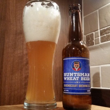 Let’s start with my catastrophic opening of Huntsman, a 4.5% ABV wheat beer that immediately after popping the cap, I knocked over, sending the stuff over the worktop and floor. QUICKLY, PICK THE DAMN BOTTLE UP! shouts my aghast soul, and in doing so when it’s upright I can see the head rising quickly up the neck of the bottle and about to spurt over the worktop, again. QUICKLY, POUR THE DAMN BOTTLE INTO THE GLASS! my now exasperated soul bellows. In doing so, the beer glass now has half beer and half head. It looks like a teenager has just poured his first beer.