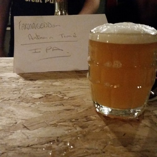 Next, on to the makeshift cask bar at the back of the pub where Farmageddon had a new 5.5% ABV Autumn Time IPA, complete with amazing branded pump signage for the first hour or so. 😉 This is a robust and hazy effort, not a million miles away from tasting like an NEIPA, but with slightly less fruity characteristics.